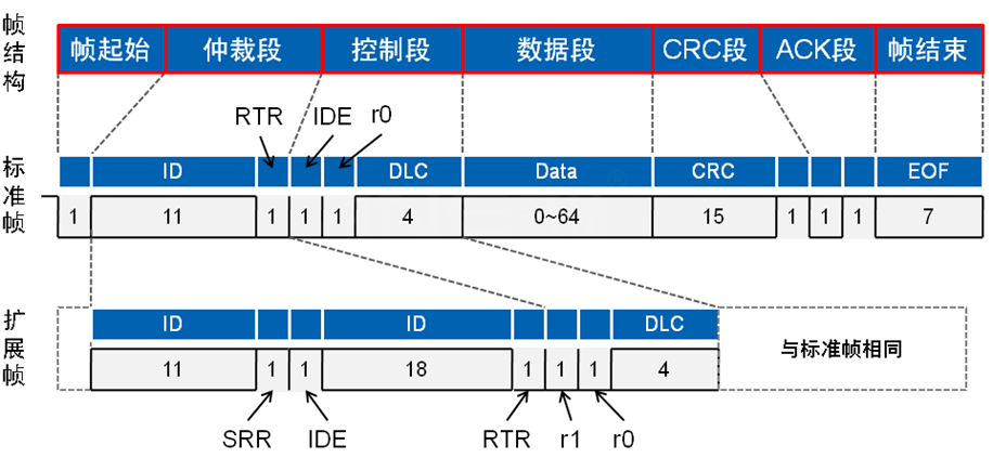 2.數(shù)據(jù)幀:結構上由7個段組成,其中根據(jù)仲裁段ID碼長度的不同,分為標準幀(CAN2.0A)和擴展幀(CAN2.0B)結構上由7個段組成,其中根據(jù)仲裁段ID碼長度的不同,分為標準幀(CAN2.0A)和擴展幀(CAN2.0B)。標準幀為11位,擴展幀為29位。這也是我們在使用中接觸最多的格式。